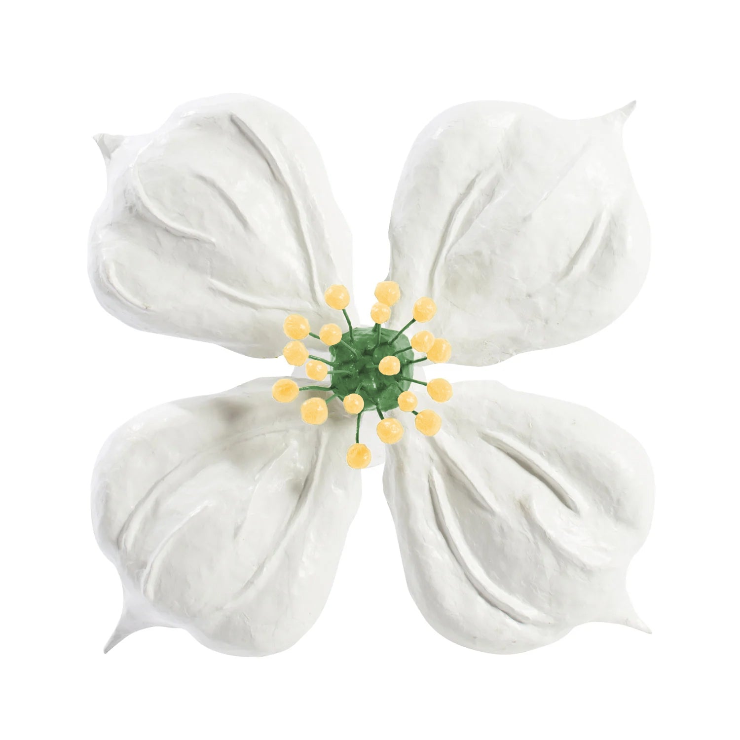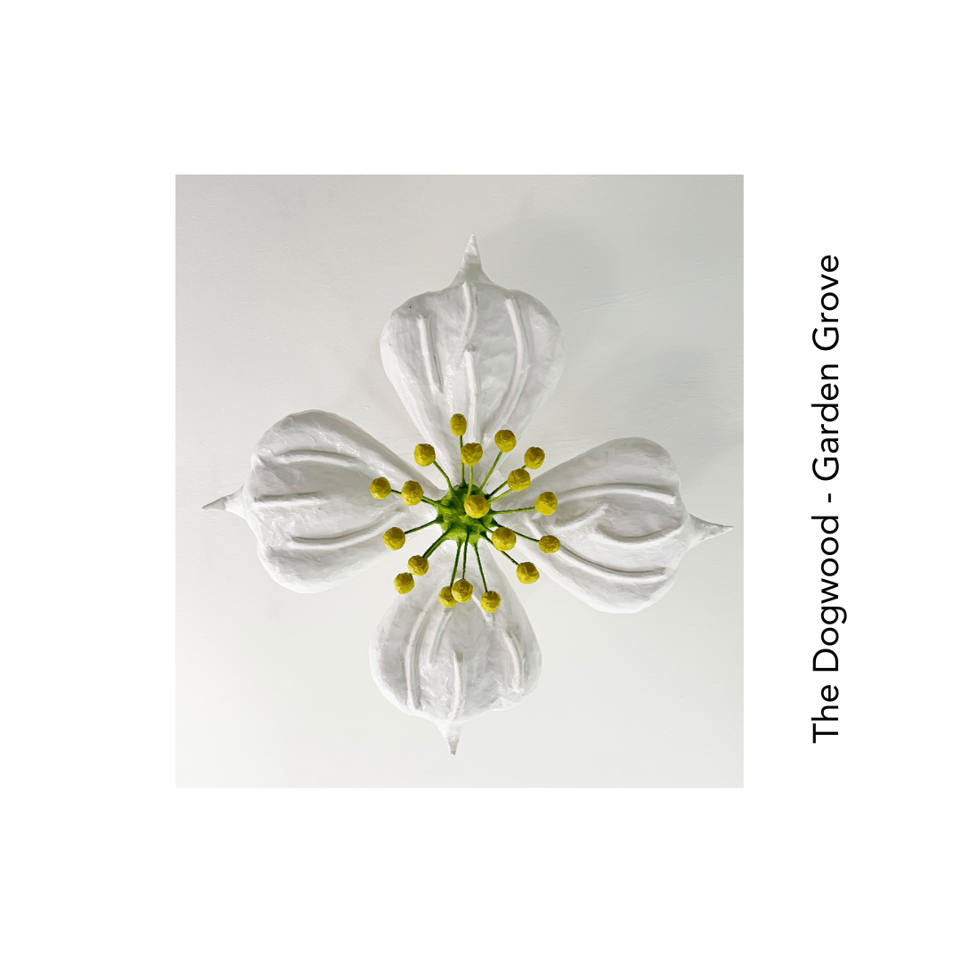 The Dogwood contains elements of enchantment and magic in it's beautiful petals. Reminiscent of fairy tale folklore, this light will bring a sense of wonder and imagination to a formerly boring ceiling. Painted with two coats of non-toxic paint and finished with one coat of poly. Papier-mâché body. Center is Douglas Fir and berries are Chartreuse by Benjamin Moore.