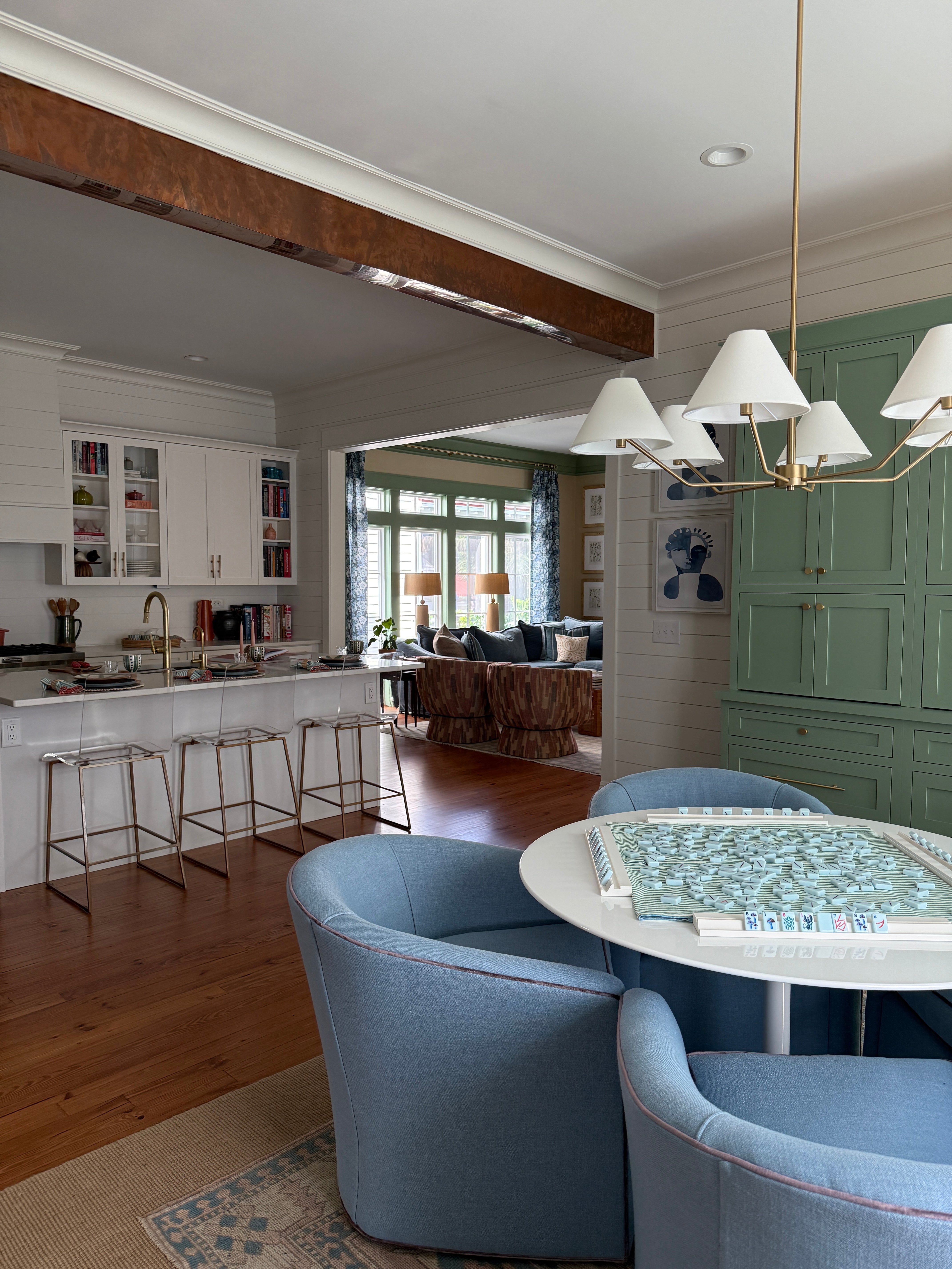 Blue and green Living room with a couch, coffee table, and large windows.