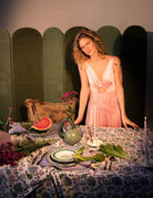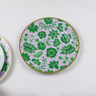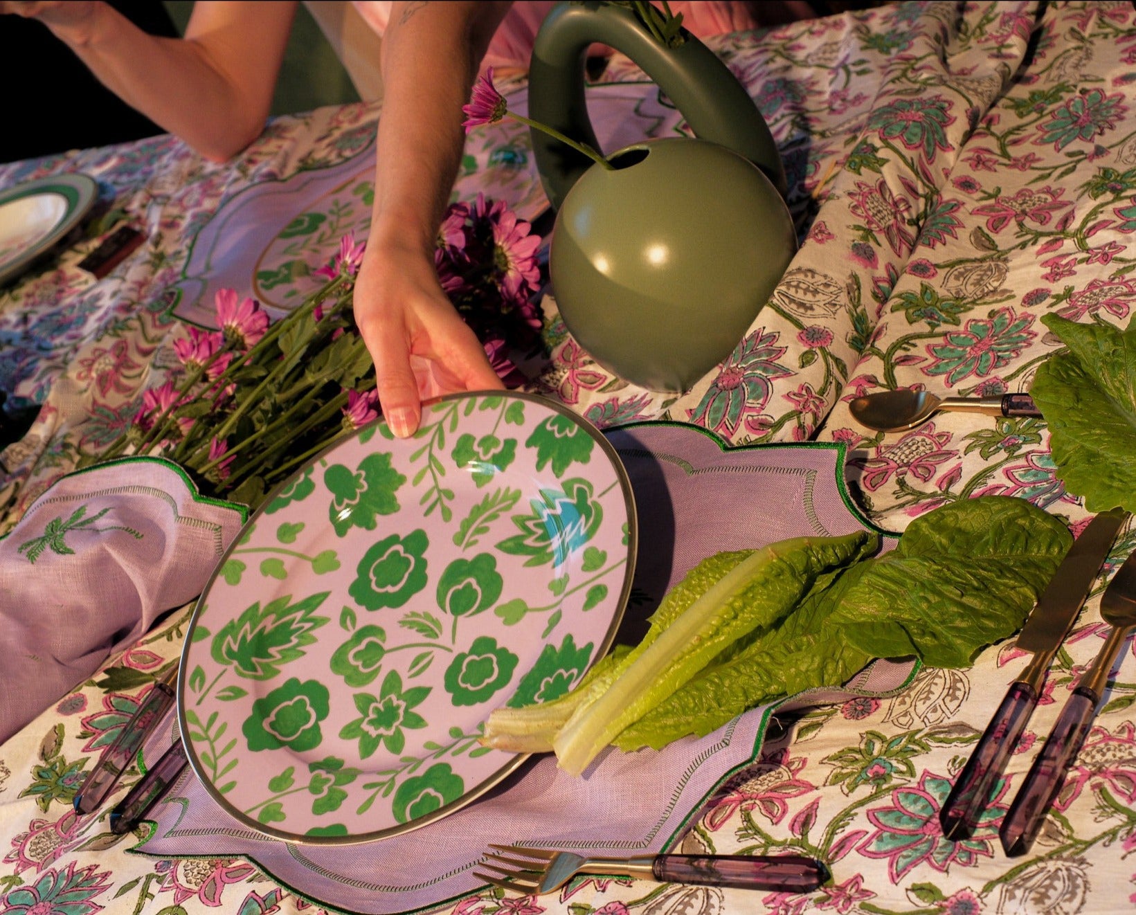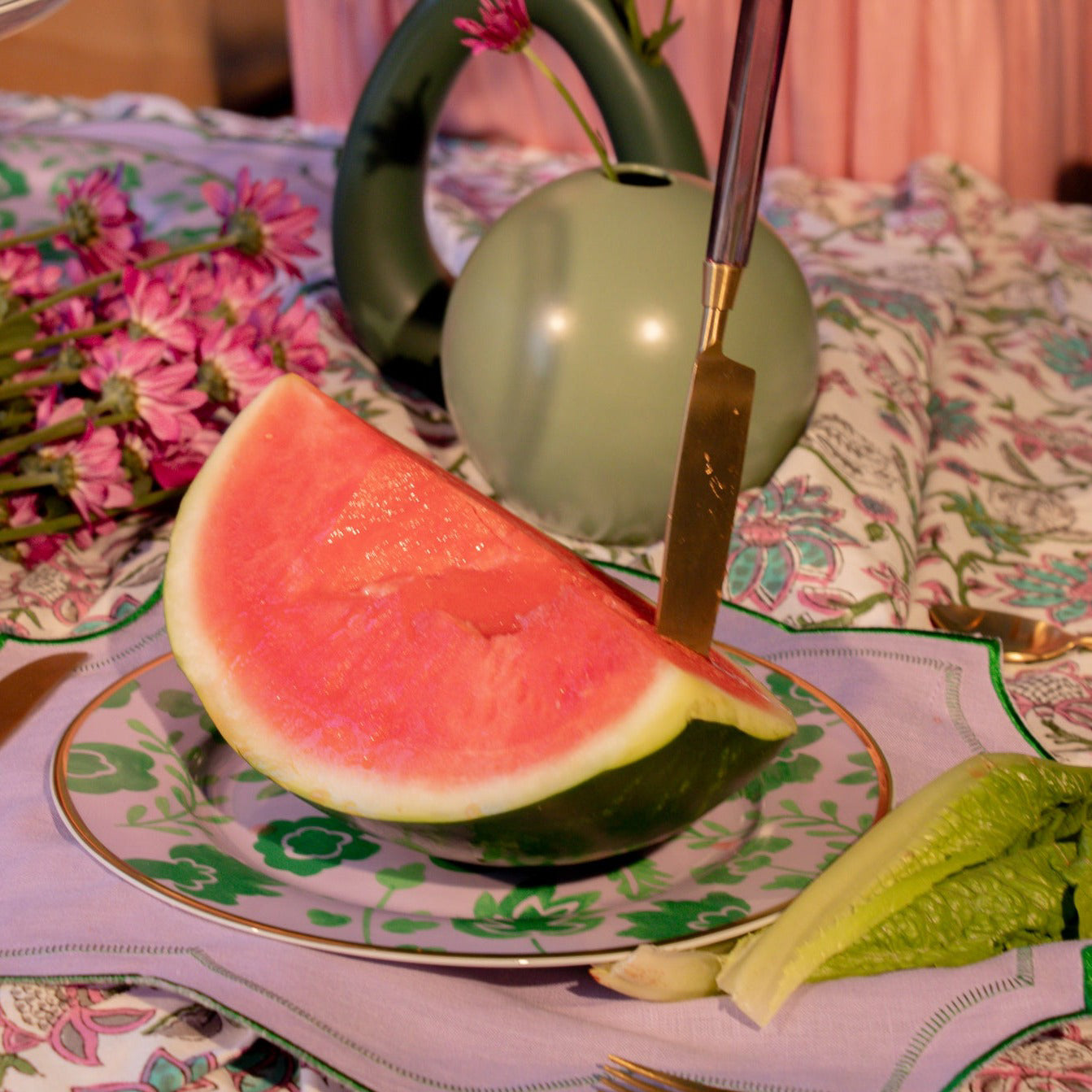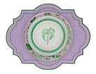 EXPERT NOTES Featuring a pastel lavender backdrop and hand-drawn verdant green bloom and leaf patterns, this dinner plate serves as the perfect companion to our Bernadette Palm Soup Bowl. Encircled with a gold rim.