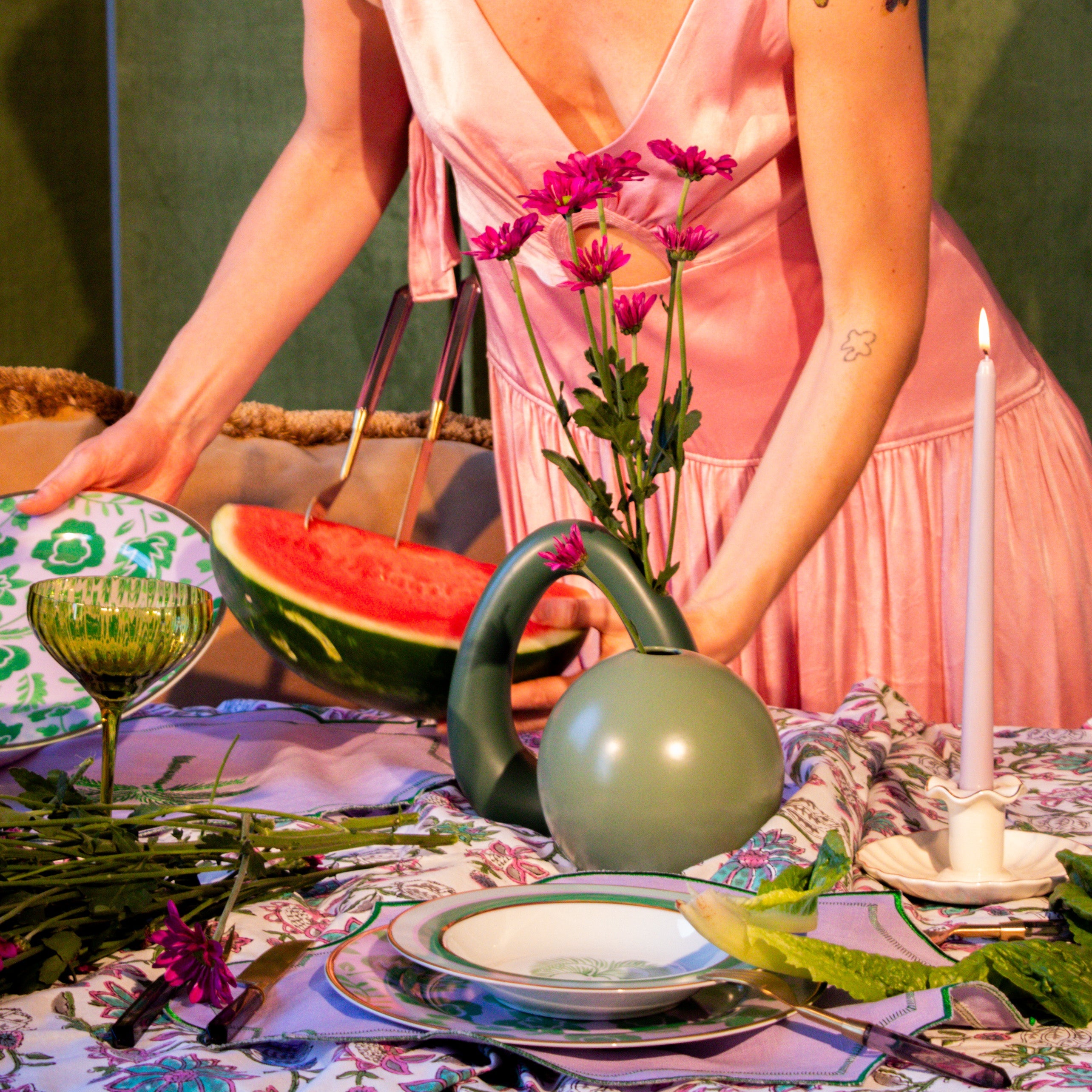 EXPERT NOTES Meticulously sculpted from a matte ceramic, its verdant green hue in a silhouette that pays homage to sleek and organic forms, embodying the allure of shaded lounges. Pair with other Vintage Palm collection pieces.