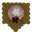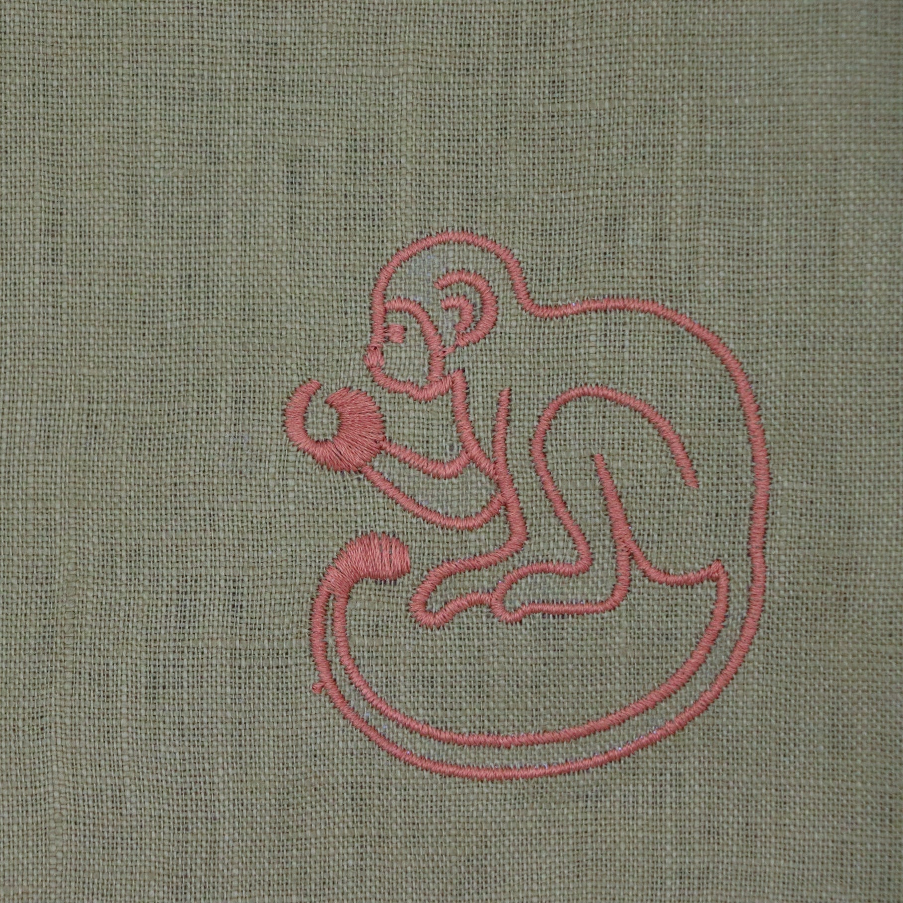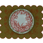 EXPERT NOTES Step into the lush embrace of the Indian tropics with our Earthen Pine Placemat from the Shimla Social Collection. Crafted from 100% khaki green linen, adorned with a brown embroidery of English florals, monkey motifs, and a scalloped trim. Pair it with our coordinating tableware from the Shimla Social collection