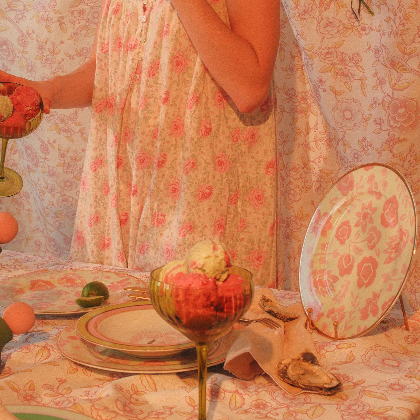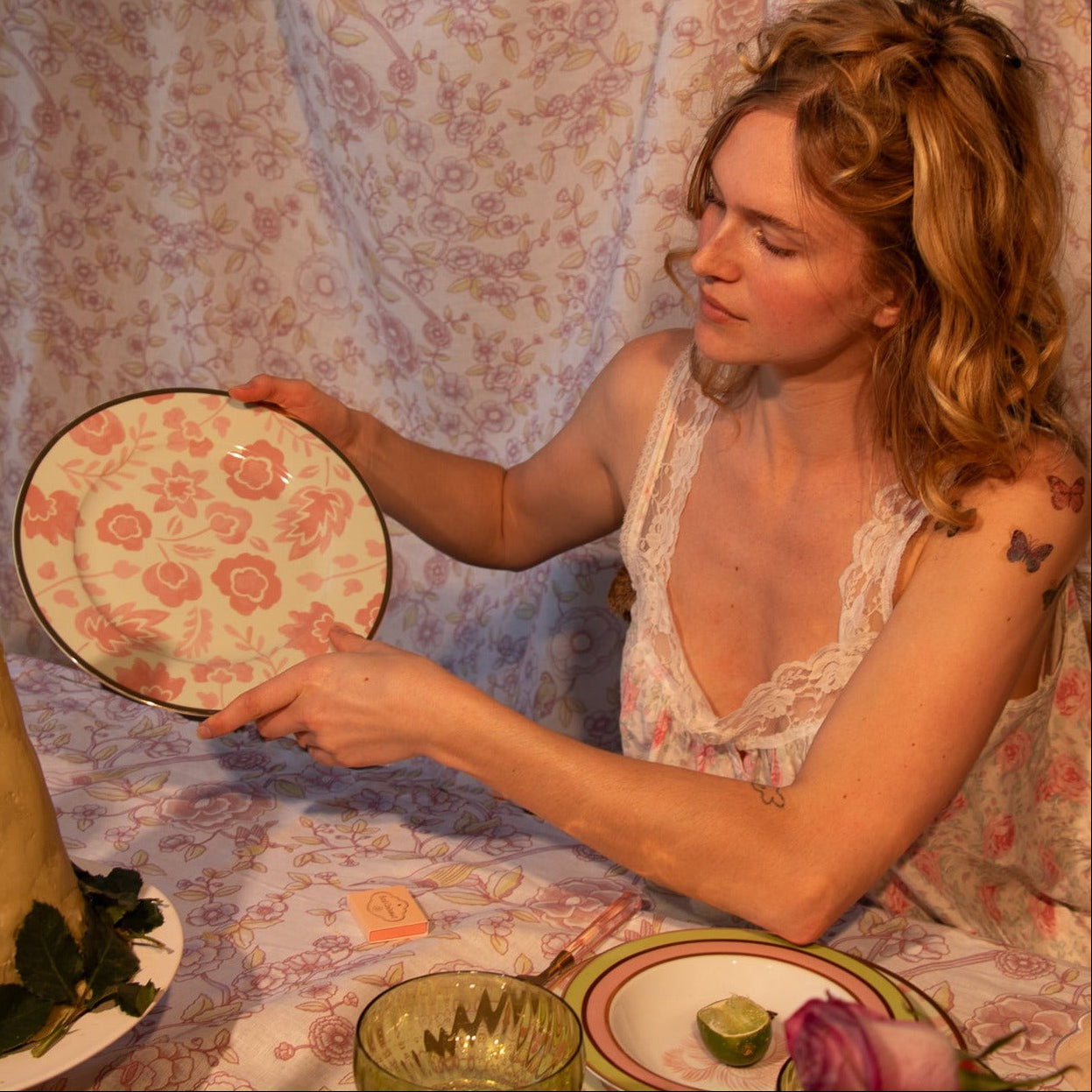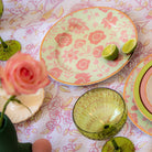 EXPERT NOTES Step into a nostalgic coastal and desert rendezvous with our Pistachio & Lychee Palm Dinner Plate. Hand-drawn blooms and leaves in soothing blush shades, against a pastel pistachio sorbet shade that echoes the timeless allure of beach sunsets and sweeping desert landscapes. Designed for the contemporary soul who is forever young at heart. Encircled with a gold rim.