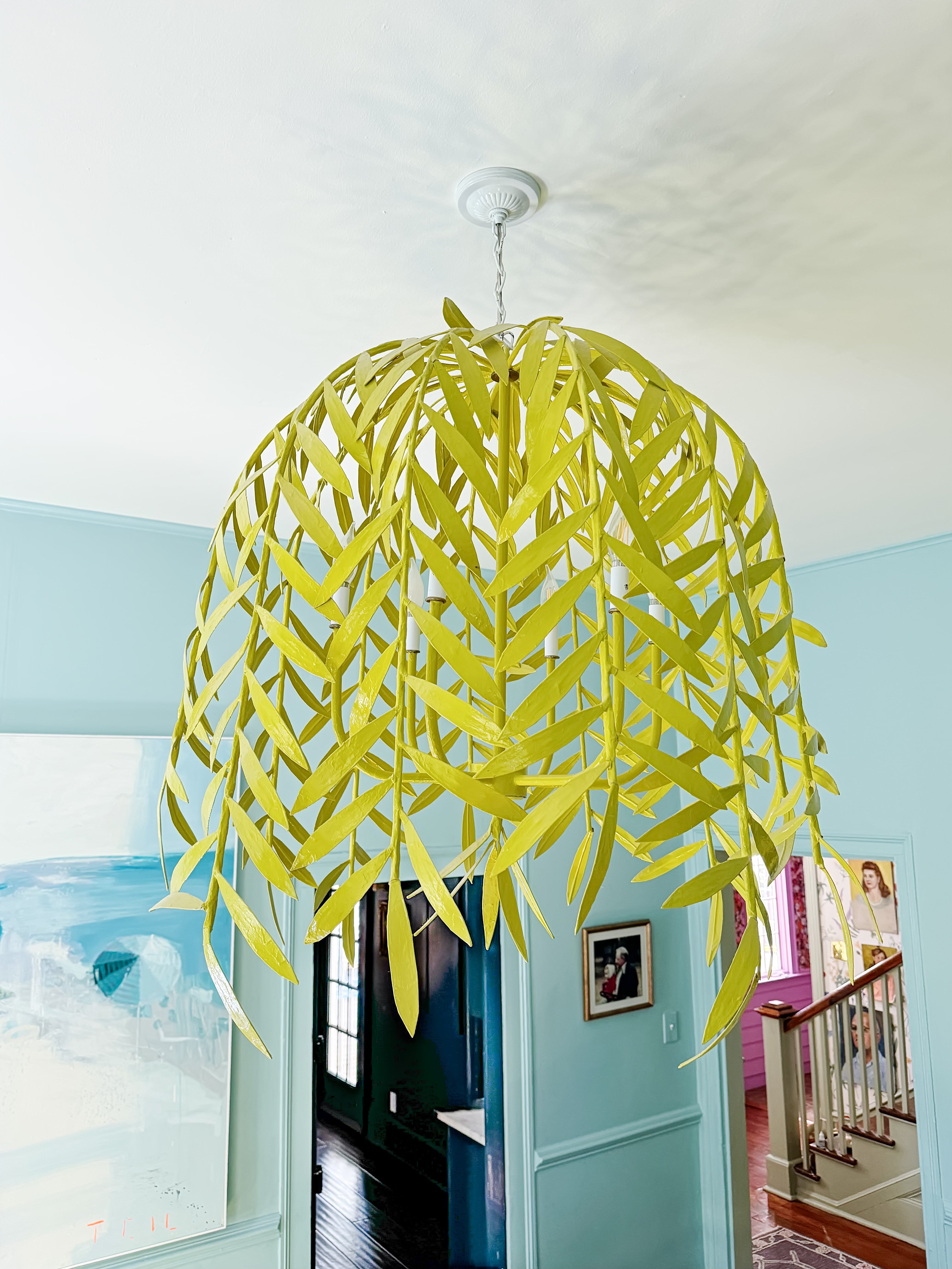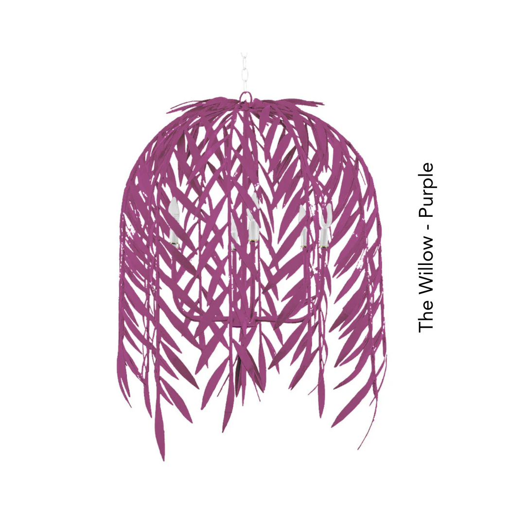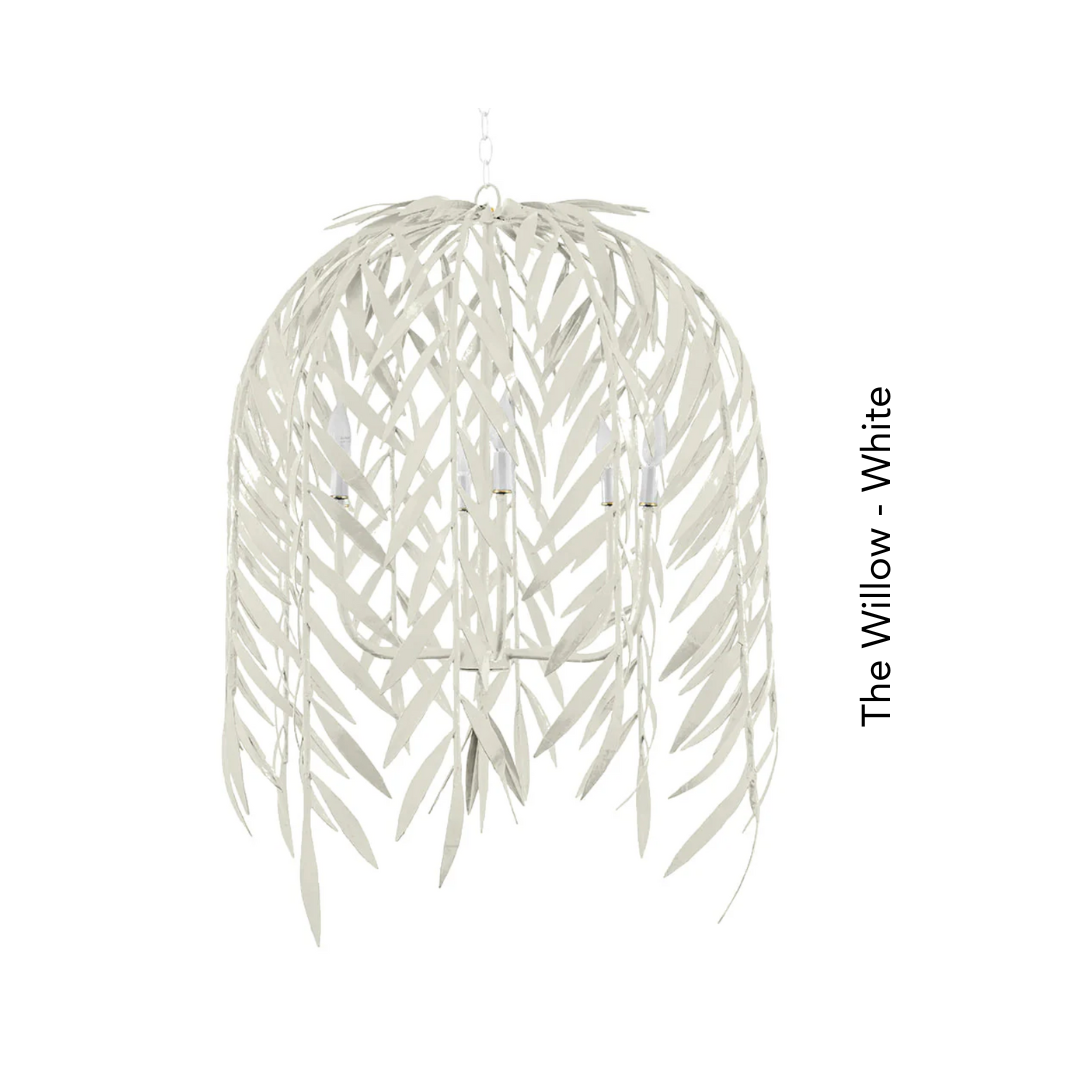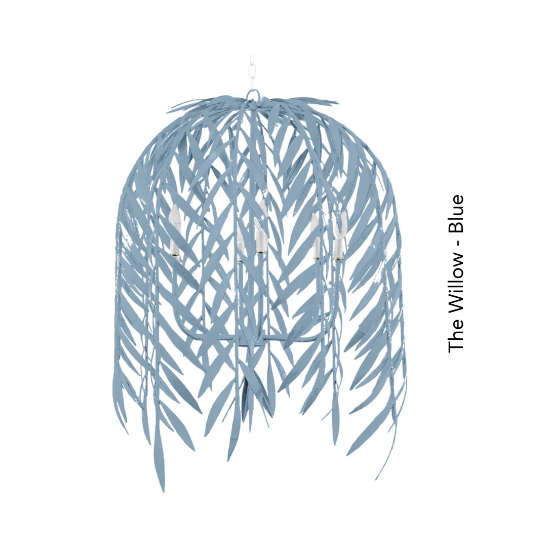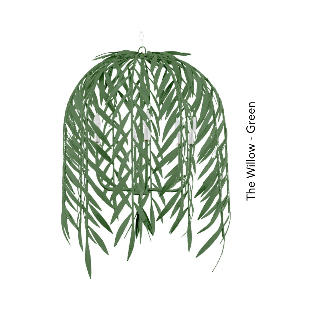 The absolutely stunning Willow chandelier is all hand crafted out of forged iron and then wrapped in layers of recycled papier mache by our ultra gifted Mexican artisans. Painted to order in 2 coats of no VOC paint and topped with a varnish. The 6 armed light fixture is tucked under the fabulous fronds.